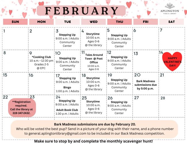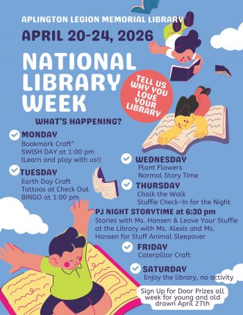 Welcome to the Aplington Legion Memorial Library. The library is your one-stop source for all of your informational needs. We have a large selection of books, magazines, newspapers, and electronic resources available to be checked out by our library cardholders. Here you will also find electronic resources, news, announcements, and a calendar of upcoming library events!